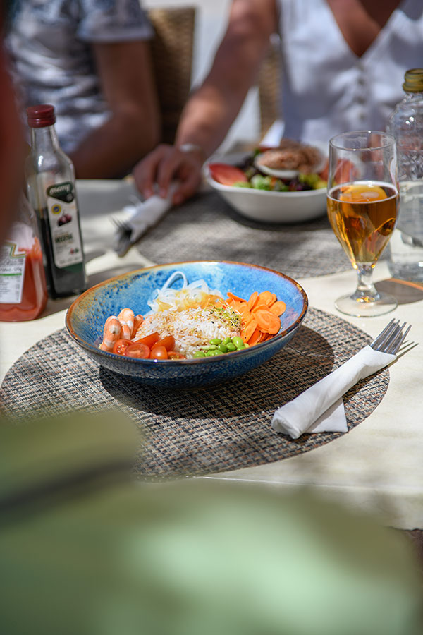 Disponemos de una terraza interior y otra en primera línea de mar, en la que servimos snacks a mediodía y convertimos en bistro o restaurante casual por la noche. Ideales para familias o cenas románticas a la luz de la luna.